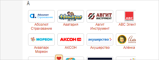 Отыскав в списке пункт «Все магазины», переходите в алфавитный указатель. Здесь надо найти букву «А».