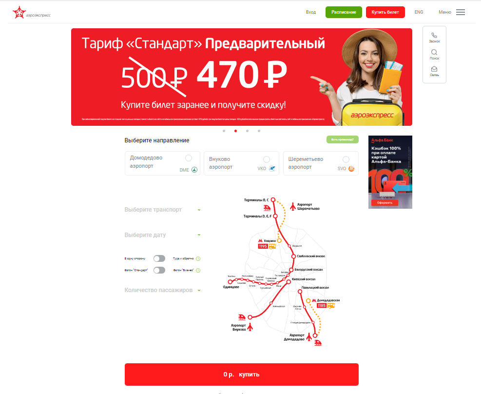 Для приобретения проездных документов в онлайн-режиме необходимо зайти на aeroexpress.ru и нажать на красную кнопку в верхней правой части экрана.