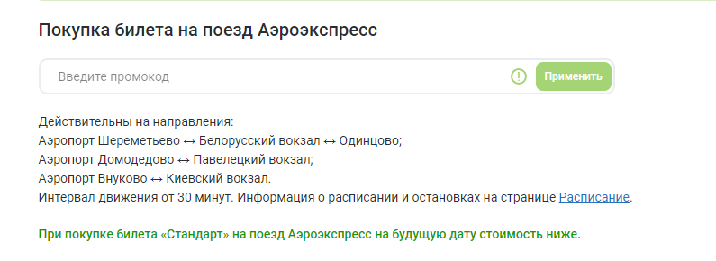 Учтите, что скидки по кодам и купонам Аэроэкспресса не активируются, если вы приобретаете проездные документы на бонусы программы лояльности.