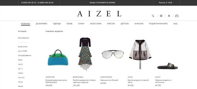 Окунуться в мир изысканности, особенно по скидкам Aizel, позволяет ассортимент. Он не настолько консервативный, по сравнению с ЦУМом, но и не такой передовой, как SVMoscow. Онлайн-бутик создан для любителей дорогих, цветных и известных вещей.