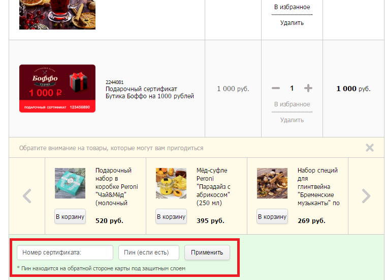 Необходимо использовать код подарочного сертификата? В таком случае следует активировать при подтверждении заказа на сайте интернет-магазина: