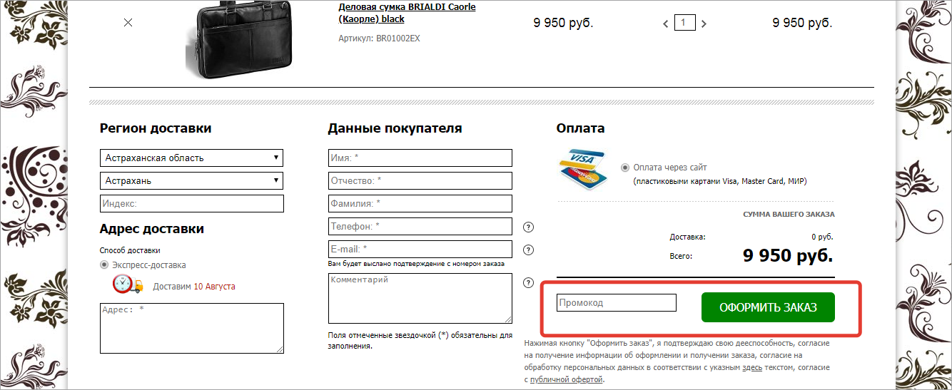 После данного действия стоит вернуться в интернет-магазин и добавить товары, которые вы хотите купить, в корзину. Перейдя в корзину, введите в соответствующее поле скопированный промокод и нажмите «оформить заказ». Но предварительно нужно заполнить и все остальные пустые поля. После ввода промокода появится новая сумма заказа с учетом скидки.