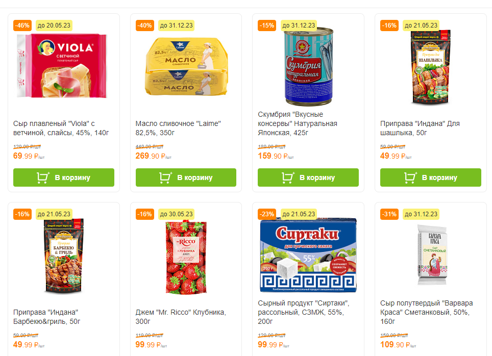 - Продукты питания: мясо, птицу, молочные продукты, сыр, яйца, хлеб и выпечку, гастрономию, бакалею, сладости, напитки, соусы, специи.