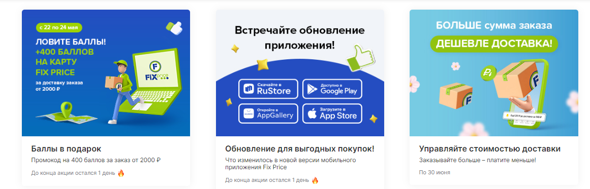- Участвовать в акциях и распродажах. Компания регулярно снижает цены на отдельные товары и на целые категории. Также проводятся всевозможные конкурсы, розыгрыши призов, спецпредложения по бесплатной доставке, удвоению баллов программы лояльности. Со всеми текущими акциями можно ознакомиться в специальном разделе сайта или приложения. Кроме того, они анонсируются в социальных сетях и рассылаются постоянным клиентам на электронную почту, в SMS и push-уведомлениях.