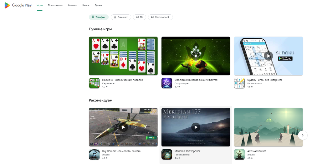 - Простота поиска. Каталог поделен на тематические разделы. В каждом из них есть подразделы: Лучшее, Рекомендации пользователей, Офлайн-доступ, Выбор редакции и т. д.