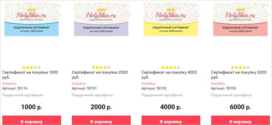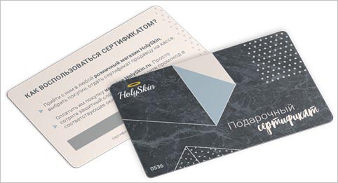 Подарите возможность совершать покупки в HolySkin своим родным и близким при помощи подарочных сертификатов номиналом на 1000, 2000, 4000 и 6000 рублей. Правила использования просты и указаны на оборотней части сертификата.