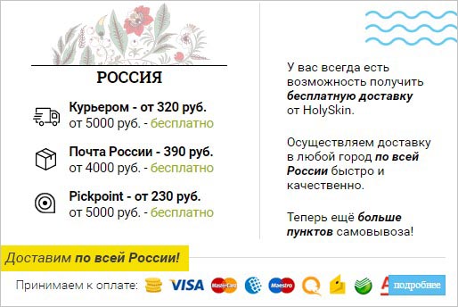Оплатить товары в интернет-магазине HolySkin можно при помощи различных способов: