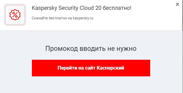 - Нажмите на кнопку «Открыть предложение», откроется небольшое окно, в котором будет написано, что промокод Kaspersky вводить не требуется.