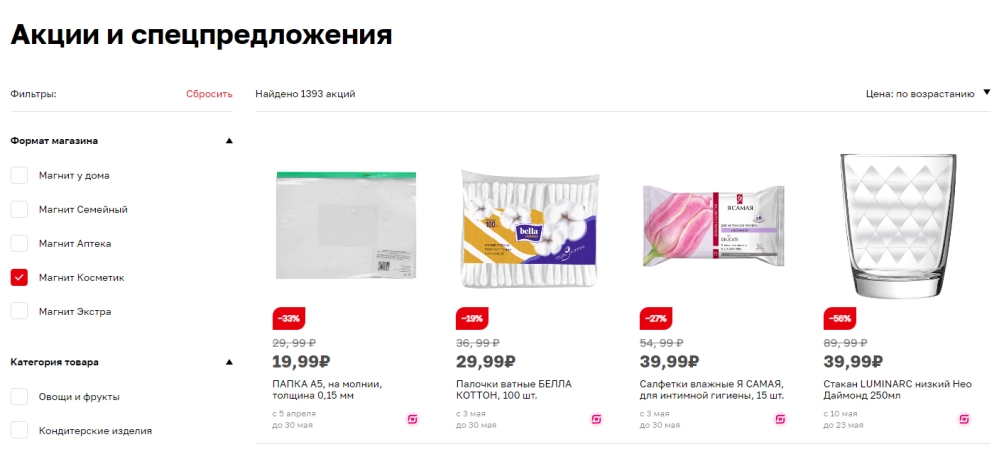 Как и во всех сетевых магазинах, в Магнит Косметик постоянно проводятся различные распродажи и акции. Их можно найти в специальном разделе сайта и приложения. Чаще всего они предусматривают скидки на отдельные товары, бренды, категории каталога. Все товары по сниженной цене отмечаются красными ценниками.