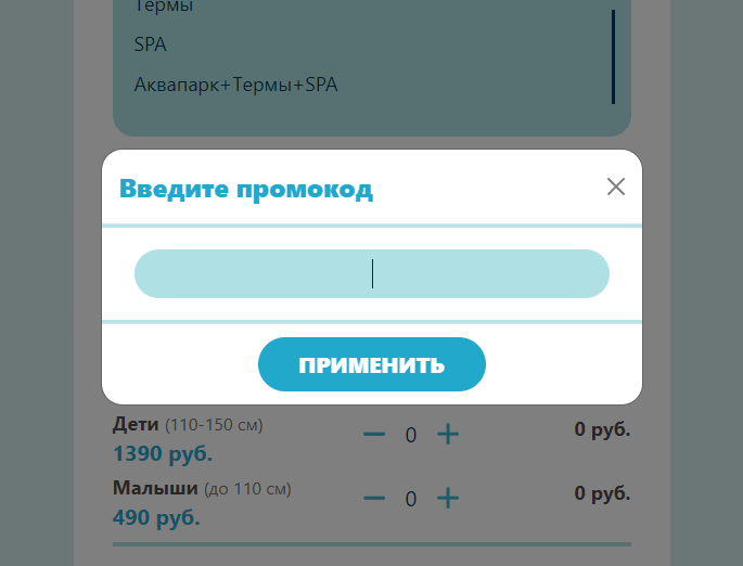 Если у вас есть промокод, воспользуйтесь им. После этого переходите к заполнению ваших данных и к оплате билетов. Она осуществляется с карты любого российского банка через систему защищенных электронных платежей. Билеты придут на указанную почту, а также будут доступны в личном кабинете на сайте аквапарка.