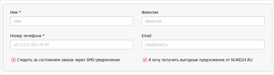 Выбрав товар и введя код на скидку в магазине Норд, клиент заполняет форму заказа с именем и контактной информацией. Здесь же по желанию можно выбрать опцию SMS-оповещений о состоянии покупки.