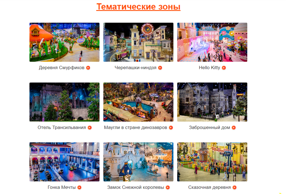 - Парк развлечений. Это 9 сказочных зон, в которых расположено около 4 десятков аттракционов. Зоны тематические, посвящены любимым детским персонажам, начиная со Смурфиков и Черепашек-ниндзя и заканчивая вампирами и динозаврами. Есть также локации с заброшенным домом, гоночным треком, сказочной деревней. В парке можно покататься на ледяной карусели, испытать иммерсивный полет, испробовать полет в тоннеле и десятки других развлечений разной степени экстремальности.