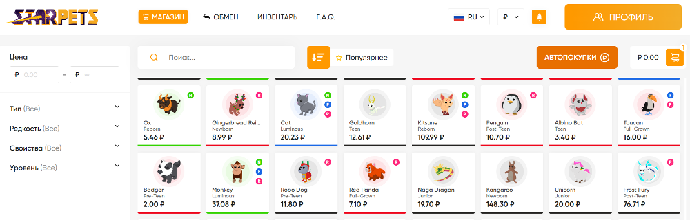 - Выберите питомцев, которых хотите купить. Для поиска доступны удобные фильтры. Например, если вы подбираете пета, вы можете задать его тип, редкость, свойства, уровень. Также есть возможность выставить минимальную и максимальную цену, за которую вы готовы сделать покупку.