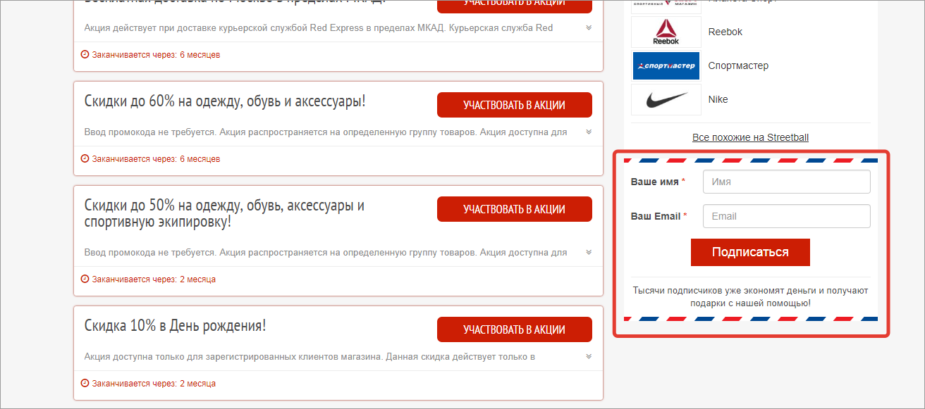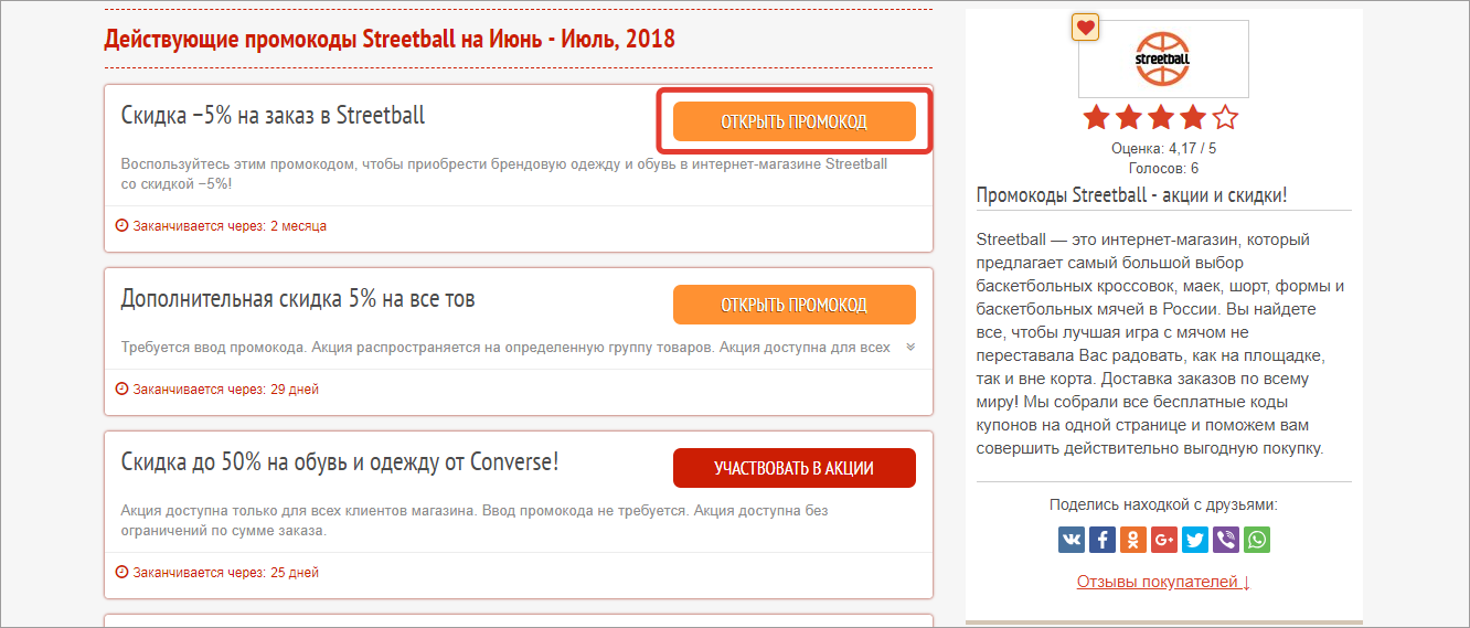 Для получения скидки в Стритбол по купону достаточно скопировать его и использовать в корзине магазина. Для этого выберите понравившийся промокод из представленных и кликните «открыть промокод» либо «участвовать в акции».