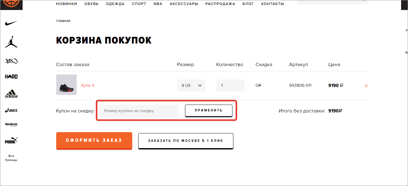 Поле для купона в Стритбол расположено после информации о приобретаемых товарах. Вставьте туда скопированную комбинацию и нажмите «применить». После данных действий на странице появится стоимость с учетом скидки.