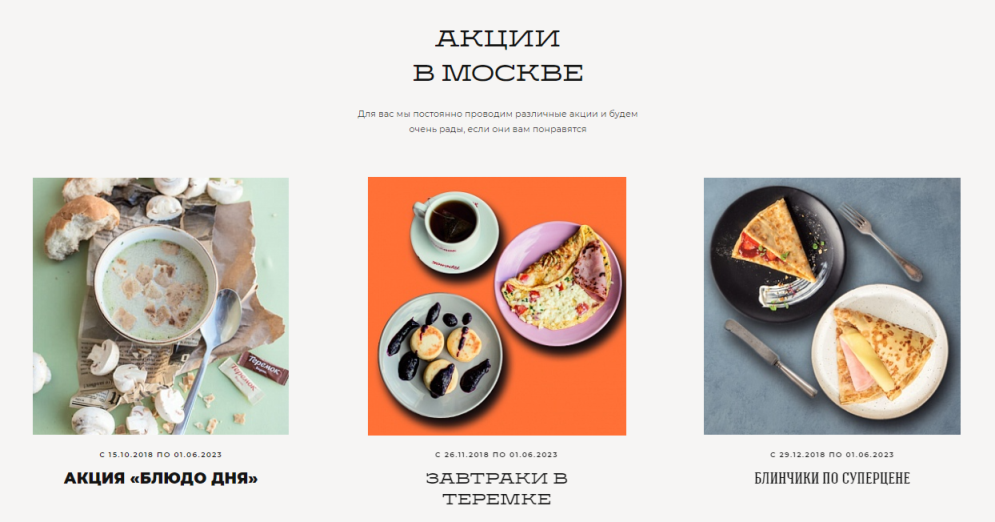 Акции могут быть самыми разными. Это «Блюдо дня» по скидке, выгодные цены на комплексные завтраки и обеды, подарки к заказу, увеличенные бонусы и многое другое.