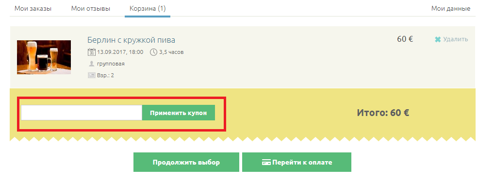 Для получения скидки необходимо активировать купоны Tezeks на сайте. Выберите город, даты поездки и подходящую экскурсию. Перейдите в корзину и укажите промокод Tezeks в поле для ввода купона: