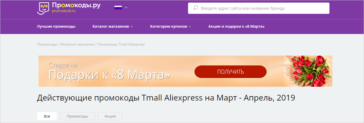 Промокоды tmall.aliexpress.com доступны на специальных ресурсах в интернете. На сайте promokodi.ru вы всегда можете найти подходящий для себя вариант.