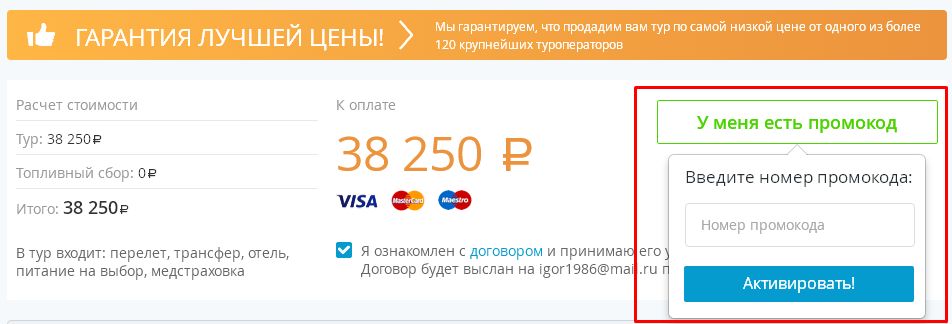 Применить промокоды для Травелата легко. Выберите тур, перейдите к оформлению заказа, введите контактные данные и укажите код в специальном поле (кликните ссылку «У меня есть промокод»):