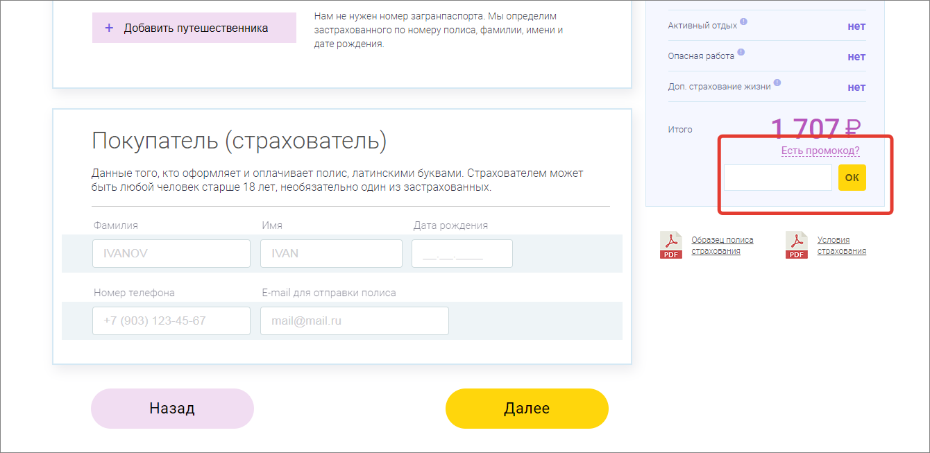 Здесь выберите нужный страховой продукт, добавьте его в корзину и нажмите «есть промокод?». Вставьте купон в пустое поле и кликните «ок». После этого вы получите новую цену продукта со скидкой.