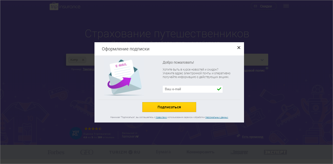 Tripinsurance.ru часто дарит своим клиентам скидки и проводит для них акции. На сайте компании есть специальный раздел «скидки». Здесь можно ввести свой e-mail и получать уведомления о всех специальных предложениях, чтобы затем оформить страховку на выгодных условиях.