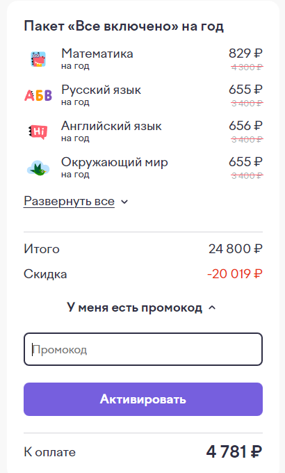 Удобнее всего пользоваться тарифом «Все включено». В него входят все курсы в соответствии с возрастом и классом обучения ребенка, а также доступ к развивающим играм, тайной лаборатории, заданием прошедших олимпиад.