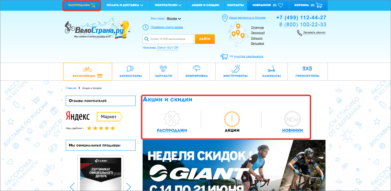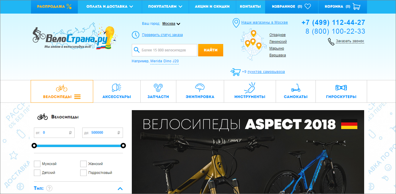 Весь ассортимент «Велостраны» представлен в интернет-магазине. Кроме широкого выбора и приятных цен, покупателей привлекает возможность совершать покупки еще более выгодно, благодаря распродажам, акциям и скидкам.