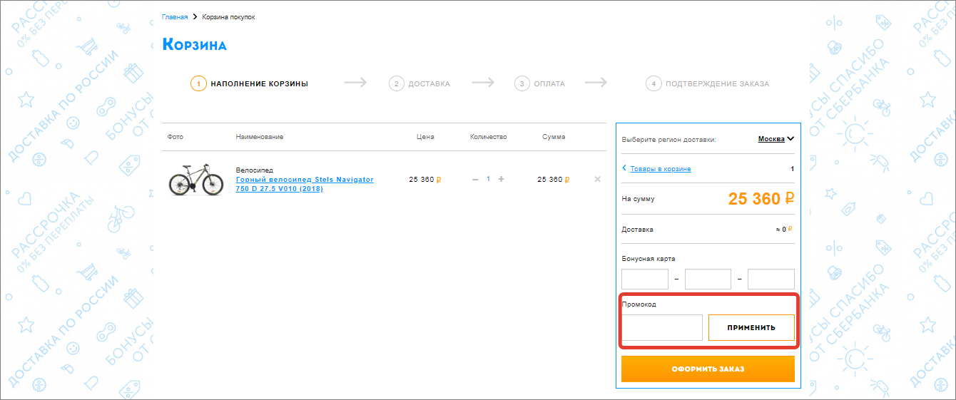 Скопируйте промокод Велострана.ру и перейдите в корзину магазина.
