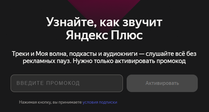 - Активировать промокоды Яндекс Музыки. Это секретные коды, которые дают небольшую скидку на оплату Плюса. Получайте их совершенно бесплатно у нас на сайте. Промокод вводится вот в это поле при покупке подписки.